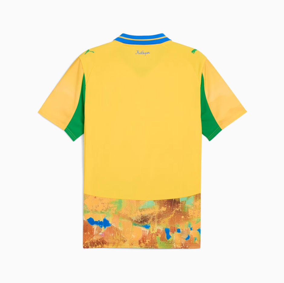 En la colaboración PUMA x KIDSUPER, la primera equipación del Mamelodi Sundowns hace lo mismo: combina tonos cálidos y soleados con otros más frescos para reflejar el estilo característico del club. El resultado captura el ritmo, la energía y la alegría del fútbol del Sundowns, conocido localmente como “shoeshine and piano”.