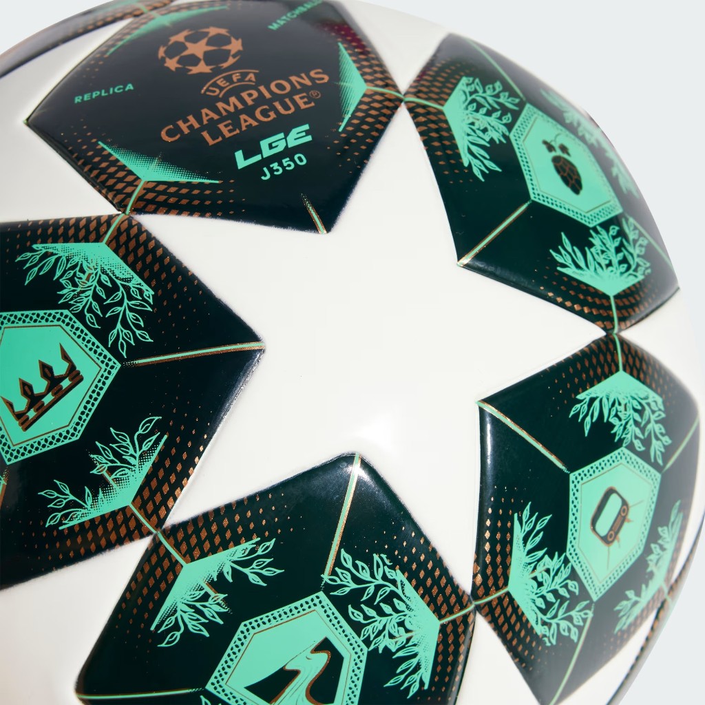 Bañado en el característico color azul verdoso de las cúpulas de cobre envejecido de Múnich y con un pintoresco fondo, este balón de fútbol adidas League se inspira en el diseño del esférico oficial de la UCL.