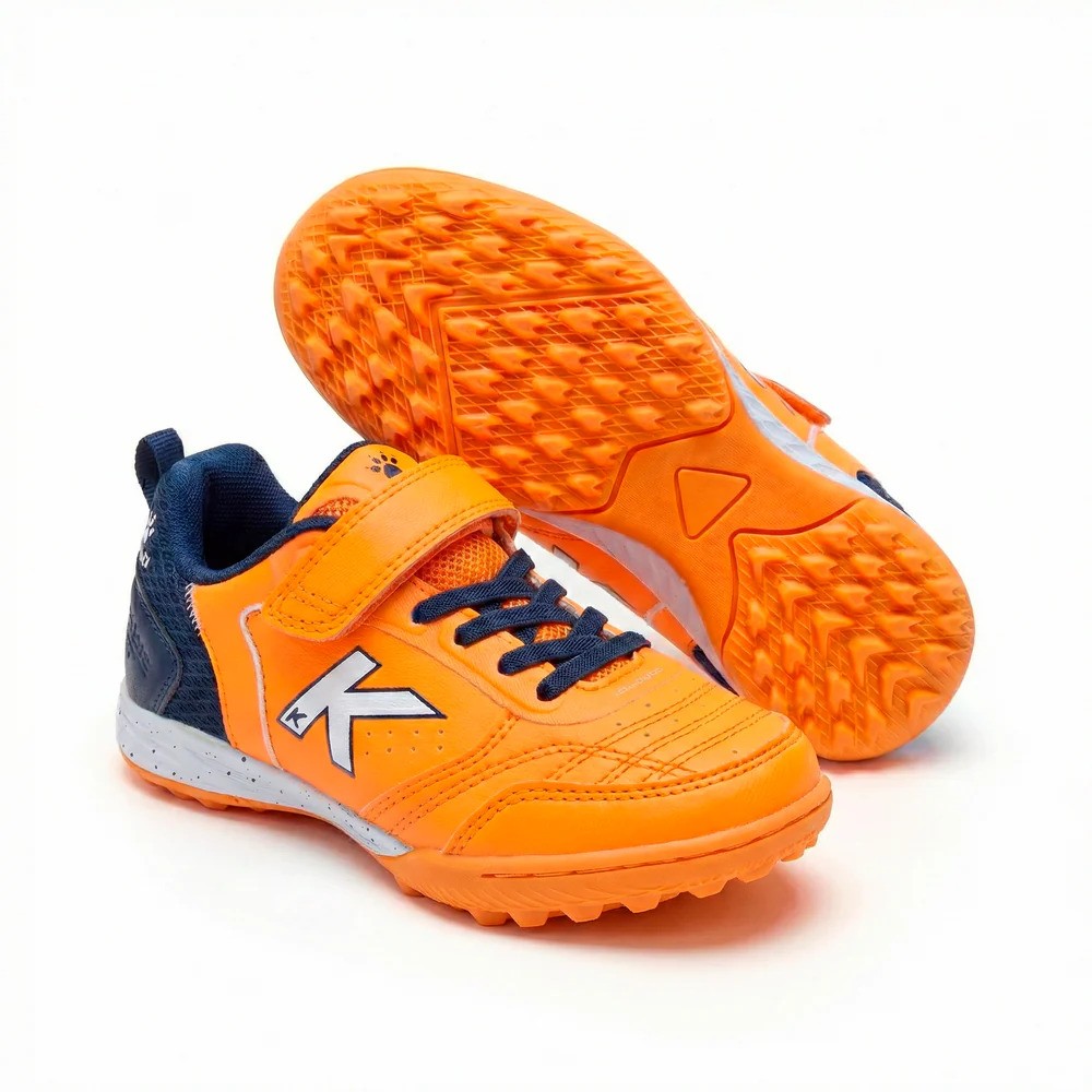 Descubre el estilo y la funcionalidad de las Zapatillas de Niño Goleiro Turf Elastic en vibrantes tonos naranjas y azules.