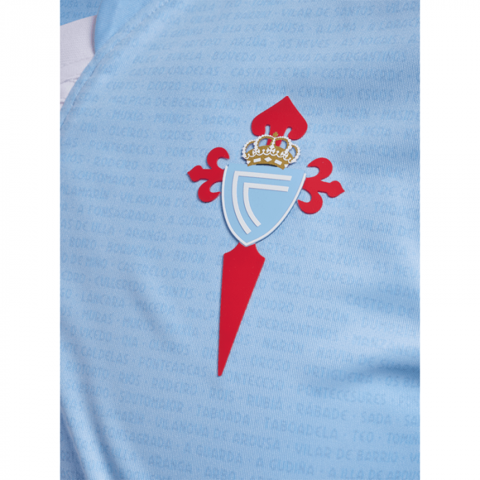 El diseño debut de hummel para el RC Celta luce en el tejido celeste la relación de los 313 municipios de la comunidad gallega en la icónica tipografía que Xosé Vizoso diseñó para el centenario. Es por ello que la celeste de la 24/25 non pode ser máis de aquí.