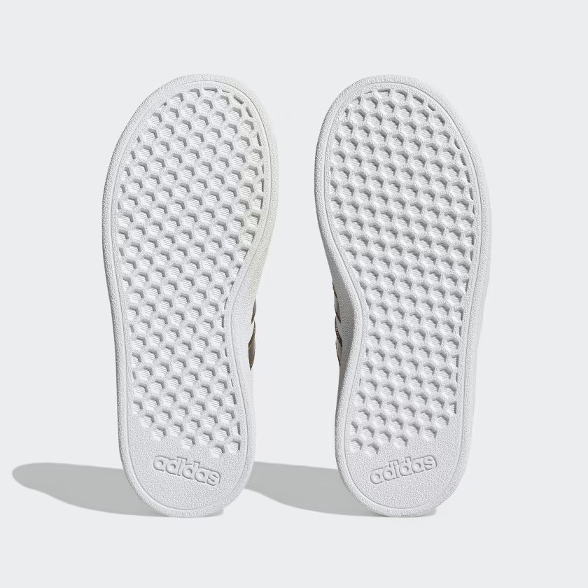 Esta zapatilla adidas para peques con estilo refleja su luz interior. Las 3 bandas, el refuerzo del talón y la etiqueta de la lengüeta lucen un acabado metalizado que destaca sobre la silueta clásica de la Grand Court.